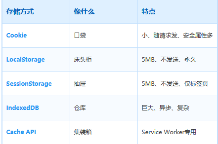IndexedDB 是浏览器内置的数据库。容量巨大,能存文件、音频、视频这些大东西。