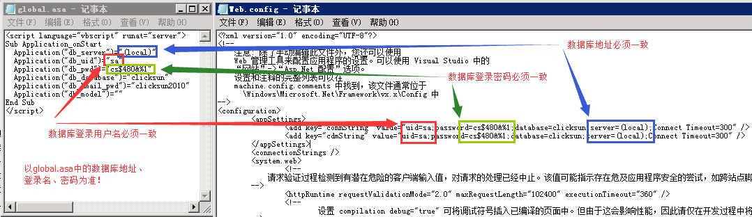 6、安装点晴OA主程序: 上面数据库附加步骤应该已经解压了点晴OA主程序文件到服务器硬盘上,点晴OA主程序目录为:clicksun,然后需做以下四个设置: a.在IIS中增加点晴MIS系统网站,参考教程:IIS增加网站及配置访问端口的方法 b.解压后务必更改点晴OA系统主程序中的数据库连接信息,数据库连接配置信息在点晴OA中要更改以下两个文件中数据库访问密码,文件的位置默认在D盘,以实际安装位置为准: D:\clicksun\global.asa D:\clicksun\web.config 用记事本程序打开以上两个文件: Application("db_server")="(local)" '这个是数据库地址(实例名称),不一定是这个,以实际名称为准 Application("db_uid")="sa" '这个是登陆账号 Application("db_pwd")="clicksun2010" '这个是该账号的登陆密码,以实际密码为准 要确保 Web.config 中的数据库访问用户名及密码与 global.asa 中的一致。 c.增加files目录读写权限:在Windows资源管理器中给clicksun目录下的files目录赋予everyone或IIS来宾用户全部访问权限,否则此问题会造成数据无法读取和写入。 d.取消files目录执行脚本的权限:为了防止用户和黑客上传ASP木马,需要取消上传文件夹files目录的IIS脚本执行权限。具体操作方法如下:打开IIS管理器,在根目录files文件夹上点击右键,选择“属性”,将该文件夹的执行权限设置为“无”即可(IIS管理器此处默认为“纯脚本或脚本”和“可执行文件”)。
