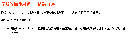 无效的操作对象-错误106,没有Adodb.Stream对象的操作权限或该对象不存在,请联系服务器管理员