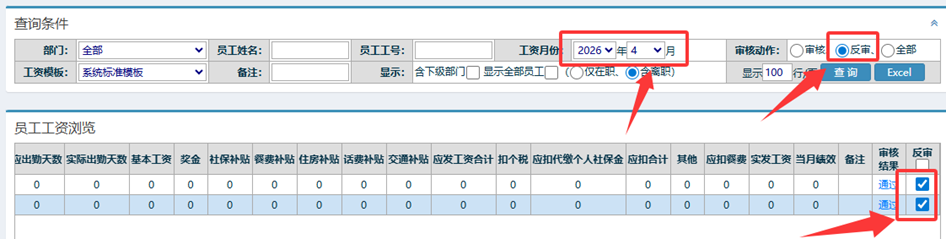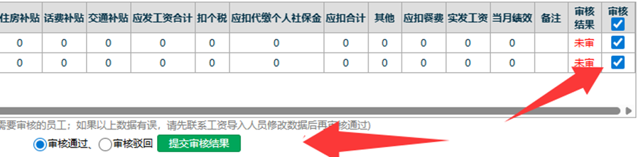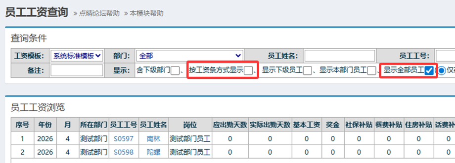 审核通过后即可查询,默认显示工资条样式,如需显示明细表格可取消勾选工资条,如需查看全部员工可勾选显示全部: