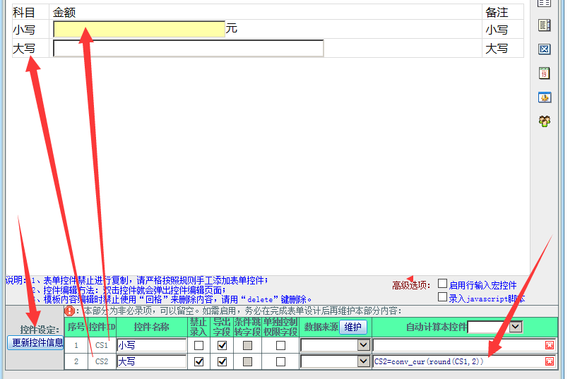 点晴OA工作流表单中实现大写金额自动转换例子参考: 在工作流表单模板中插入两个字段,将其中一个字段的公式设置为另一个的大写,申请时就可以自动转为大写了。 ![]() 点击“自动计算本控件”: ![]() 该文章在 2019/4/3 10:49:18 编辑过