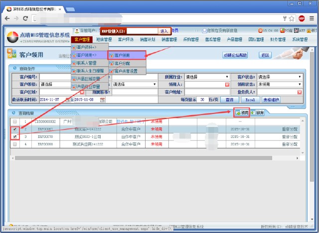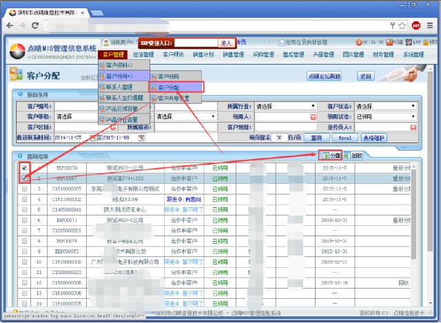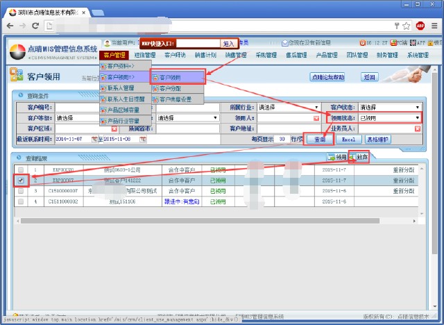 操作步骤:客户管理——客户领用——客户分配——选择目标客户——点击分配按钮;如下图所示: