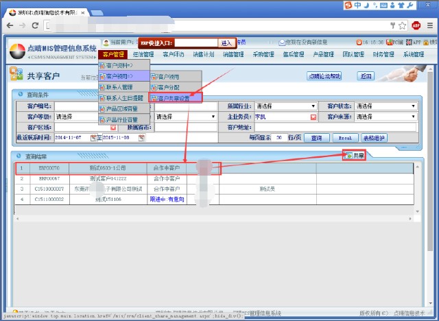 操作步骤:客户管理——客户领用——客户共享设置——选择目标客户——点击共享按钮;如下图: