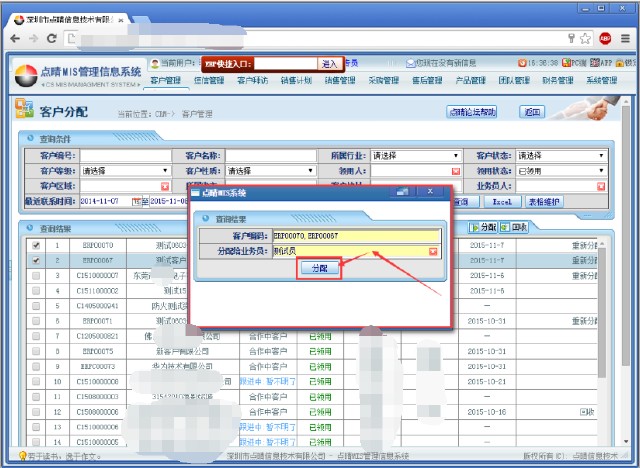 客户分配运用一般情况:在业务员离职或者岗位调整情况下,由上级主管将该员工的客户分配给其他员工;