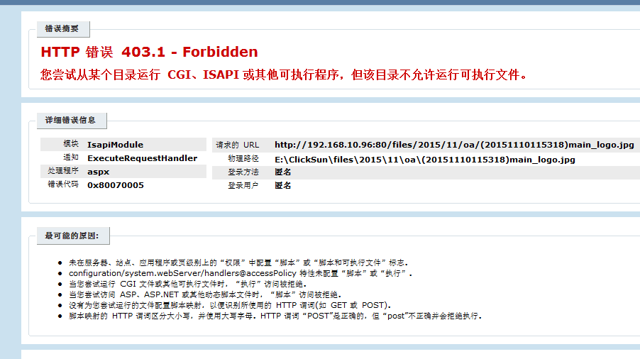 [点晴IM即时通讯系统]点晴OA上传jpg、png和gif格式logo或印章图片后无法显示,提示:http错误403.1Forbidden您尝试从某个目录运行CGI、ISAPI或其他可执行程序,但该目录不允许运行可执行文件,如何解决?