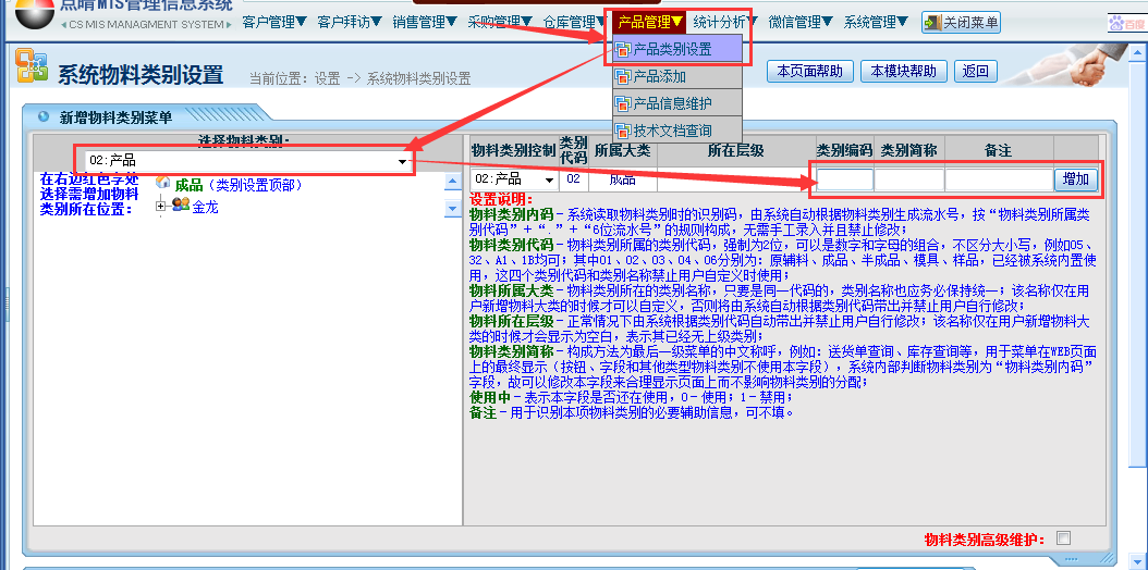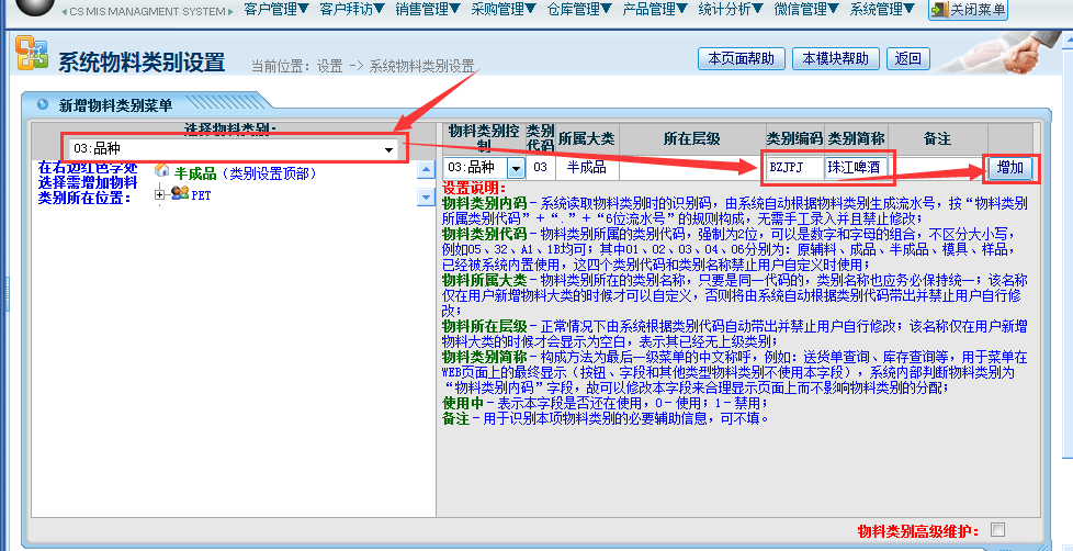 操作:产品管理——产品类别设置——选择品种——录入类别编码与类别简称——点击“增加”按钮;如下图所示: