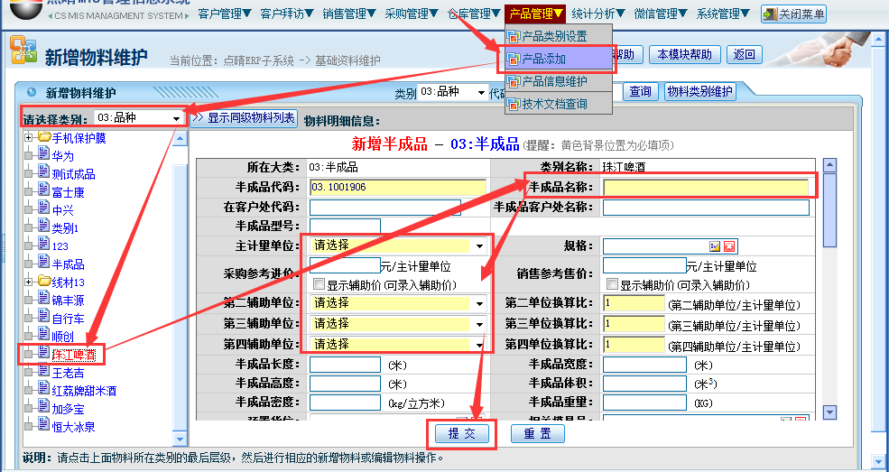 操作:产品管理——产品添加——选择品种——录入对应品种的名称以及单位——点击“提交”