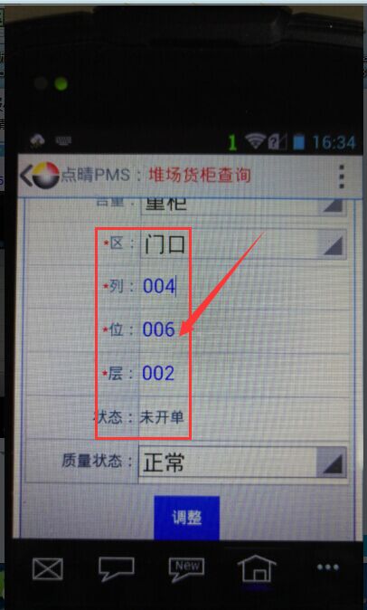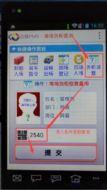 终端机操作步骤:进入“点晴PMS扫码界面”——点击货柜调整按钮(图标)——录入需调整货柜号尾数3位或4位——点击“提交”