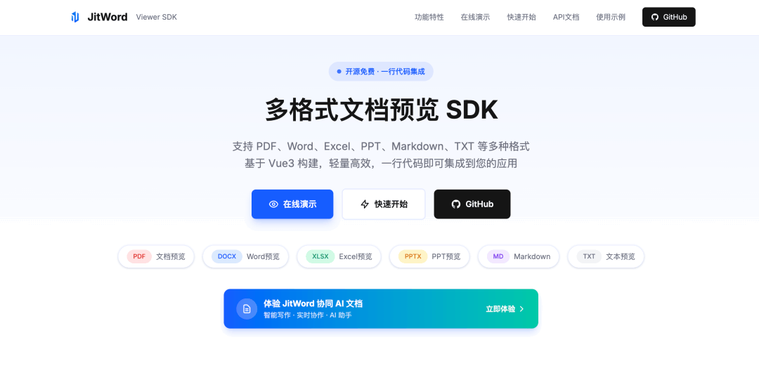 最近我们团队为了满足更多开发者的需求,实现了一款能直接在浏览器中预览Office文件(word,pdf,ppt,excel,markdown,txt)的SDK——jit-viewer。什么是jit-viewer它是一个纯前端文件预览SDK,支持Word、Excel、PPT、PDF四大主流格式(当然我们也支持了Mark...