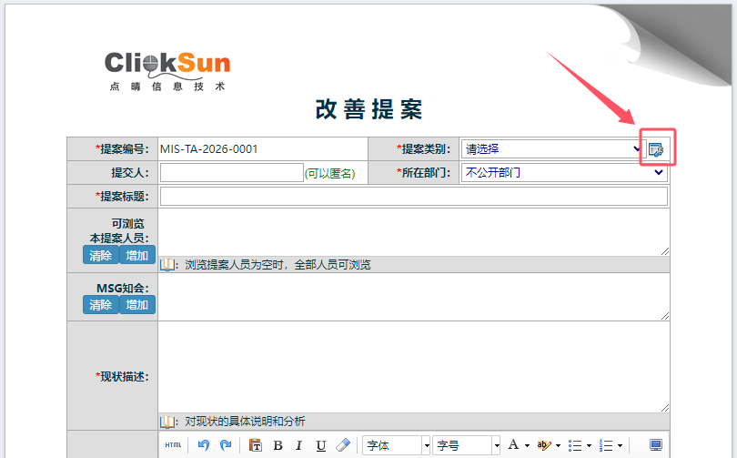 以管理员身份登录点晴MIS系统,新增改善提案时,在提案类别后面,会看到有一个编辑图标,点击进入,即可编辑改善提案类别: