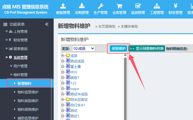 进入点晴ERP子系统-》系统管理-》物料管理-》新增物料(需要有此页面操作权限):一、新增物料大类类别点击页面上的“类别维护”按钮:如果是需要增加新的物料大类,那么直接在右边输入新的物料类别信息即可,注意上面红色框中内容,此时必须是“新增类别”,填写具体...
