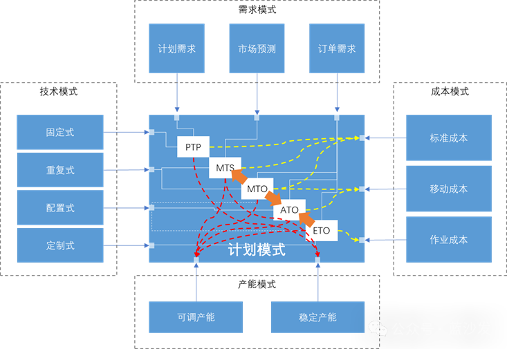 SAP的五种计划模式比较SAP预配置了30多种生产计划模式,这些计划模式的形成是由技术、需求、产能、成本、多种因素共同驱动和决定的,下面结合这四种要素针对其中的五种典型模式予以分析。注:图中的橙色粗箭头表示计划模式演进方向(详见下文中MTO和ETO的补充说明部分)。业务要素模式需求要素模式:计划需求--来自外部因素决定...
