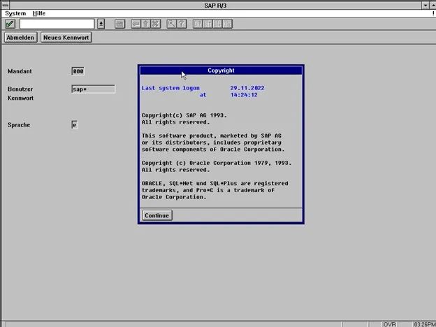 今天看到了一篇文章,上面有不少SAP30多年前的系统界面,有点感触,所以写了这篇文章。现在就让我们回到过去,时间点是1994年,可能有些读者还未出生了。当时SAP的版本是:SAPR/32.1D,我们一起看看当时的系统界面,并从界面中看看当时的系统架构和功能。系统登录界面从下图的登录界面,可以看到30多年前的SAP就支持...