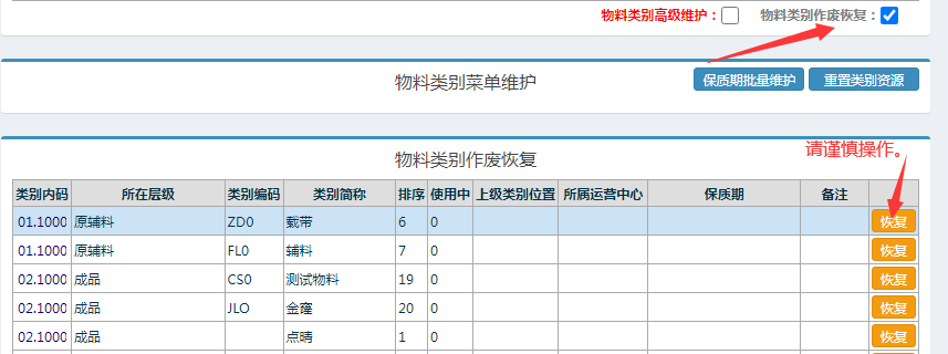 新建的物料类别不小心删除掉了,不想重建,如何恢复?进入ERP系统管理--》物料管理--》物料类别维护,勾选物料类别作废恢复选项;选择需要恢复的类别,点击恢复进行操作,如果已经有相同的类别编码的类别禁止重复恢复。恢复类别,属于ERP基础设置,请谨慎操作。
