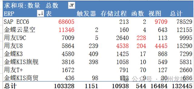 ERP有前台也有后台,前台有各种菜单,后台有各种数据对象。数据对象主要有:表,触发器,存储过程,函数和视图。表的数量基本跟ERP的菜单和功能的数量成正比,而其他数据对象各有各的功能。下面将金蝶、用友、SAP的8款ERPDEMO数据库,整理了一下,做了这张图。8款ERP分别是SAPECC6、金蝶云星空、用友U9C、用友U...