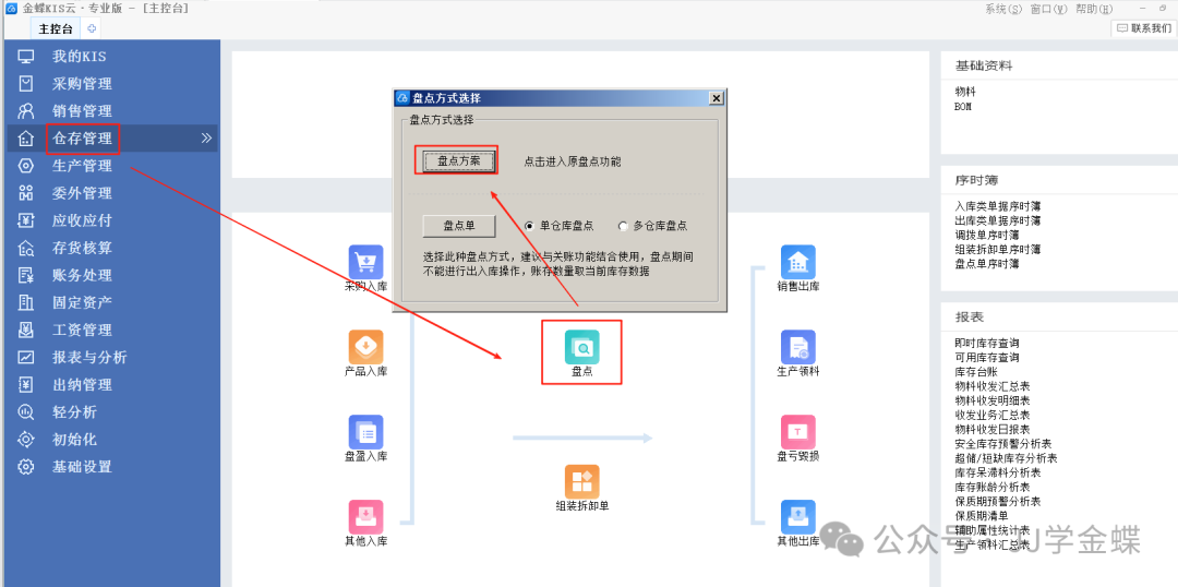 金蝶KIS专业版盘点单操作流程上一篇详细介绍了金蝶KIS专业版盘点单的操作流程。然而,由于盘点单存在不能超过1000条分录的局限性,在物料种类繁多的制造企业中,盘点单功能难以发挥作用。此时,就需要借助盘点方案的功能。盘点基本流程:1.新建盘点方案2.盘点数据录入3.编制盘点报告4.盘盈盘亏处理盘点操作步骤:1、盘点备...