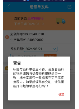 超领单扫码发料,提示标签与领料单信息不符怎么处理?遇到这种问题,都是标签与超领单的领料宽度不符造成的,只要修改领料单的超领宽度即可解决!在ERP,超领出库明细管理中找到对应的超领出库单。点击编辑按钮,选择对应的宽度明细,重新编辑该超领单。重新去APP,进行扫码超领出库。