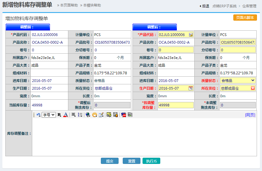 【点晴模切ERP】物料二维码标签上的生产日期/质量状态/货位/批号/保质期等信息有错误时,要如何进行修改正确?如果确认物料二维码标签上的生产日期/质量状态/货位/批号/保质期等信息有错误时,需要在仓库管理-》物料在库管理-》新增状态调整单中,找到有问题的物料记录,进行相应信息修改:选中需要更改信息的物料,点击按钮“增加...