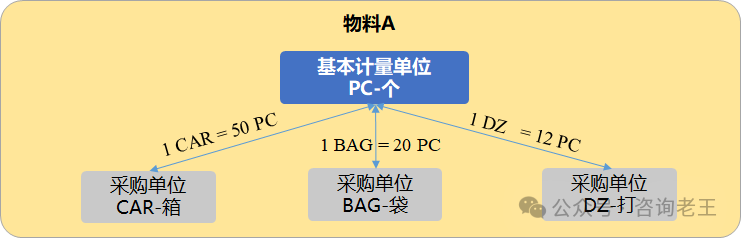 1业务问题描述在物料采购业务中,对很多物料可能都会涉及采购单位的问题,即一个物料的库存基本计量单位可能是“副”,但在实际采购业务过程中,因为包装规格的不同,采购时可能需要按“捆”、“袋”、“箱”等单位进行采购,那在系统如何按这些不同的采购单位进行采购订单的创建呢?有的小伙伴会说,那就启用物料的采购订单单位,并维护好和基...