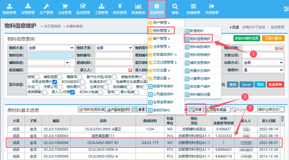 操作步骤:系统管理——物料管理——物料信息维护;进入页面后如下图操作: