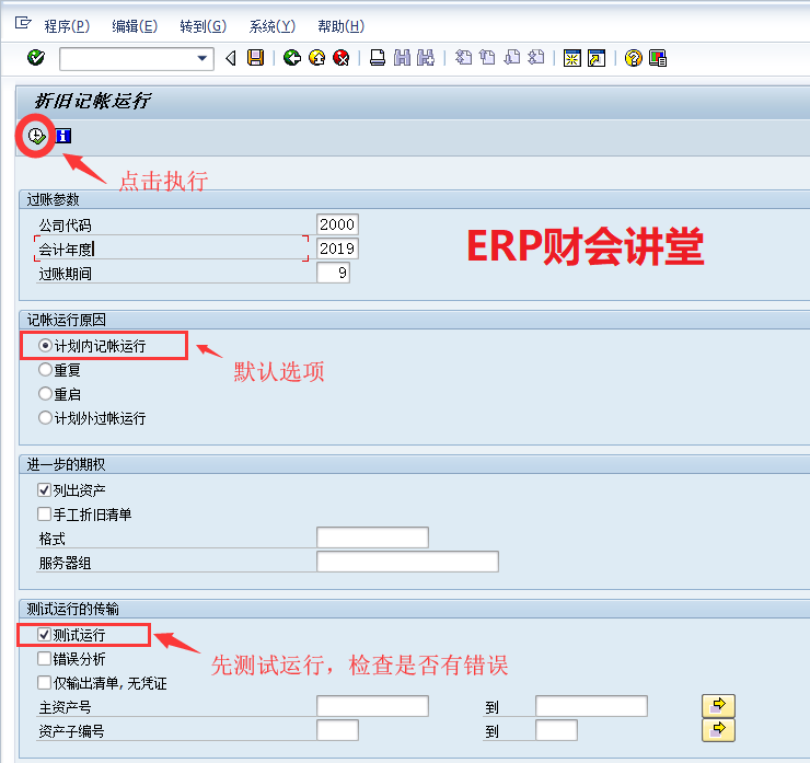 运行资产折旧是财务必备的月度工作,一般在月底执行。SAP中运行资产折旧必须作为后台作业执行,并且可以将其定义为周期性作业,每月最后一天定时执行。本文介绍SAP中运行资产折旧的具体操作。AFAB进入资产折旧运行界面如下:一般测试运行无误后再正式运行,点击红圈中的图标执行测试运行:联机处理时系统默认最多处理1000条数据,...