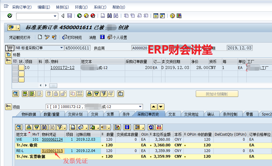 SAP中采购发票录入之后,如果发现有错误,我们不能直接FB08冲销会计凭证,需要通过事务码MR8M冲销发票,生成冲销的发票凭证。并且冲销发票凭证之后,需要手工将对应的会计凭证清账。例如,采购订单4500001611对应的发票凭证5105601315有错误,需要冲销。冲销之前ME23N查看采购订单历史如下图。FBL1N查...