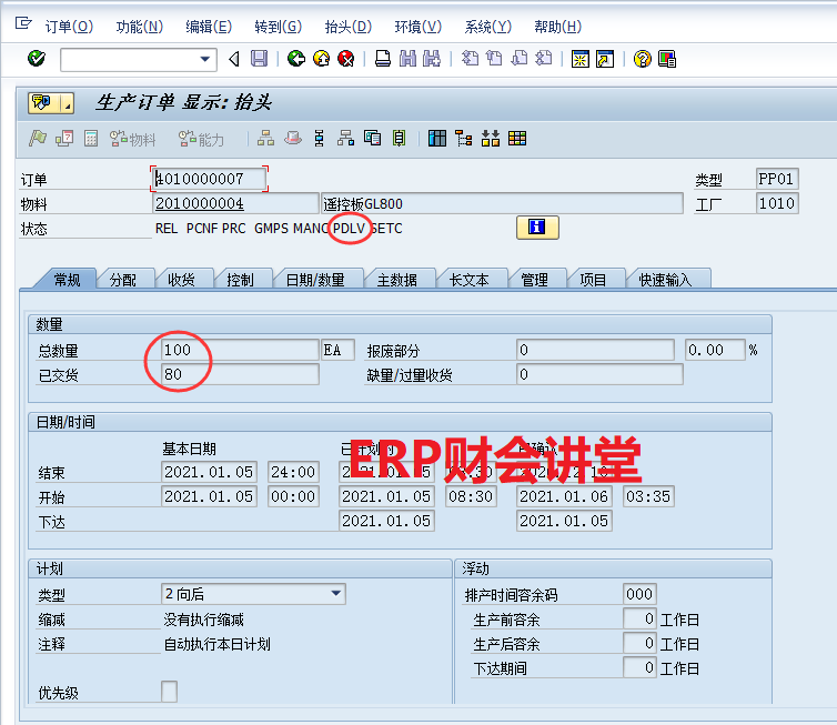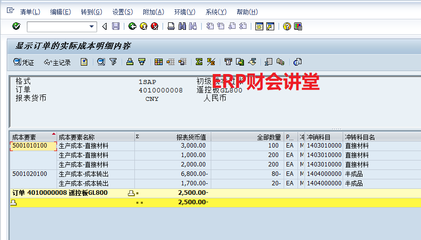 在产品(WIP)即尚未完工的产品,CO月结时,对状态为PDLV的订单计算WIP,状态为DLV或TECO的订单计算差异。对于生产订单,CO以实际成本来计算WIP,即使用公式“投入–产出=WIP”。“投入”为计入订单的各项成本,“产出”为成品入库结转的金额。以订单4010000007为例,计划数量100,实际生产80,状态...