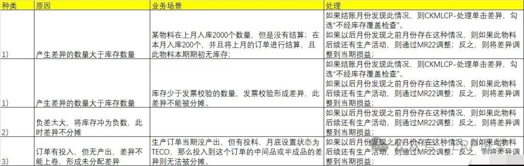 SAP物料账未分摊&未分配差异:1.当月有262退货或者有261发货,但是没有101收货,即工单有投入,但无产出,则当月工单结算差异就会形成未分摊差异;2.工单结算数量大于库存数量,差异不能完全吸收就会形成未分摊差异;3.工单结算规则手工改变导致系统想分分不出去,形成未分摊差异;4.返工工单投A,然后根据产出数...