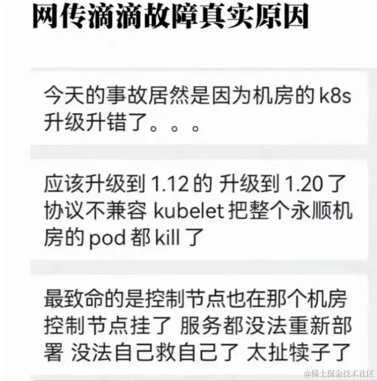 一、概述2023年11月27日晚间,“滴滴崩了”登上热搜,包括滴滴打车、青桔、小桔充电等多个服务出现问题,导致用户无法使用。11月29日,滴滴官方发表声明,事故起因是底层系统软件发生故障,并非网传的“遭受攻击”,更有网友表明是k8s升级版本导致的问题。什么是k8s,Kubernetes(k8s)是Google开源的容器...