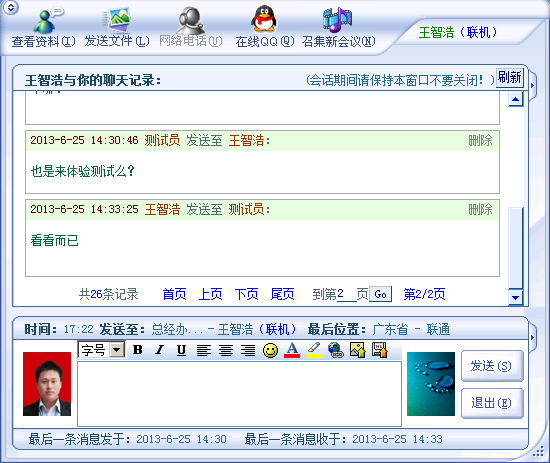 点晴免费OA协同办公管理信息系统存在类似于QQ的客户端软件吗? 无事可做(381852408) 15:39:47 有客户端, 陶(604648) 15:39:53 有。PC客户端和手机端都有。。 ![]() 点晴MIS信息通介绍: 点晴MIS信息通是点晴公司基于点晴MIS系统推出的在PC上运行的独立企业IM交流系统(类似于腾讯RTX基于企业内部组织机构及人员的沟通工具),是点晴MIS系统在PC上的有力帮手和功能补充。 点晴MIS信息通是运行在Windows版本PC机上的独立程序,可以快捷方便的完成如下一些主要功能: 1、用户不需要长期打开点晴MIS系统WEB页面,有新信息时(通知、会议、WEB端短信通新信息、工作流提醒、审批、工作联络单、Email、ERP异常订单、订单审批等所有新信息),点晴MIS短信通会主动弹出窗口提醒用户,用户点击后可以立即查看并处理新信息; 2、用户与用户之间的交流沟通,不需要通过点晴MIS系统的WEB方式进行交流,直接在点晴MIS信息通中就可以完成,而且实时高效; 3、用户与用户之间的文件传送不再受制于WEB浏览器的限制,文件传送可以达到网络极速。并且如果交流双方都在同一个局域网时,系统智能切换为P2P(点对点)方式,文件和信息的交互不需要通过服务器中转,也不需要占用公网带宽,直接以内网最高带宽传送; 4、点晴MIS系统中的网盘文件管理在之前的WEB方式上增加了通过点晴MIS信息通的管理方式,文件传送不再受制于WEB浏览器,可以以网络最大带宽传送至服务器上,并且支持文件夹直接传送至服务器中。