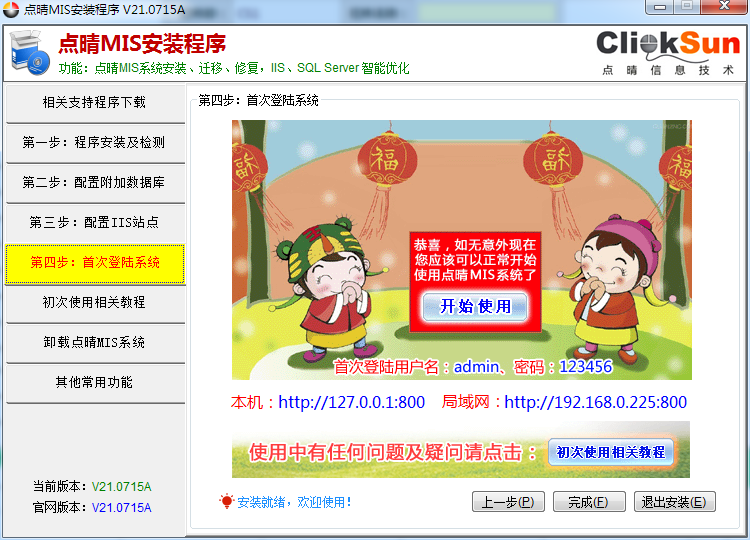 一、先确保OA服务器上可以正常访问点晴OA: 首先,打开OA服务器上的浏览器,在地址栏输入安装程序第四步所显示的点晴OA服务器本机IP地址:http://127.0.0.1:800/,注意如果不是80端口,那么还要在后面附加上相应的访问端口800。一定要能够看到点晴OA的登录界面才算正常,如果看不到就应该是安装有问题,先按照教程http://half.oa22.cn修复试试。 然后,打开用户电脑上的浏览器,在地址栏输入安装程序第四步所显示的点晴OA服务器局域网IP地址:http://192.168.0.225:800/,注意如果不是80端口,那么还要在后面附加上相应的访问端口800。一定要能够看到点晴OA登录界面才算正常,如果看不到就是服务器IP地址有误,或者此用户电脑和点晴OA服务器不在同一个局域网内,如果不在同一个局域网内,其他电脑是无法直接访问到点晴OA的。 看到点晴OA系统的登陆界面后,输入登陆用户名和密码(默认登录用户名为 admin,然后点击登录,再输入密码,密码为123456),点击“登陆”便可进入点晴OA系统。 注意:个别用户在自己电脑上用http://127.0.0.1来访问点晴OA服务器,并说怎么无法访问, 二、为确保局域网内其他电脑成功访问点晴OA系统,务必注意以下几点: 1、OA服务器网卡必须插上网线,不允许使用无线网卡 作为OA服务器,必须使用有线网络连接,并且网卡必须插上网线连通到局域网内(网卡未插上网线会导致网卡设置的IP地址无效),不允许使用无线网卡连接到局域网内。 2、务必将OA服务器网卡设置为固定的IP地址(内网直接用IP访问,不要使用计算机名或域名访问) 作为OA服务器,安装点晴OA的服务器IP地址必须、也一定要设置为固定的IP地址,不允许设置为自动从路由器动态获取IP地址,这样访问点晴OA的地址就不会变来变去。 相关帖子:如何手动设置点晴MIS系统所在服务器的固定IP地址 特别注意:设置好OA服务器的IP地址后,一定要用刚刚设置好的IP在OA服务器上直接访问一下,确保在OA服务器上用这个IP能够正常访问使用! 3、在Windows防火墙中开放800、58000端口 Windows防火墙会阻止其他电脑访问OA,请在防火墙中开放以上两个端口,800是WEB网站服务端口(如果是其他端口,则改为其他端口)、58000是点晴MIS信息通服务端口。 相关帖子:服务器本机可以访问,局域网其他电脑无法访问,防火墙未开放80端口造成的 4、局域网的安全设置 少数用户提出点晴OA服务器的Windows关闭放火墙后仍然不能访问,请检查网络的安全设置,或者是否安装了其他防火墙功能的杀毒软件之类的第三方安全程序,如果有的话,必须将800/58000端口或IIS程序加入白名单,或者干脆卸载这类程序。
