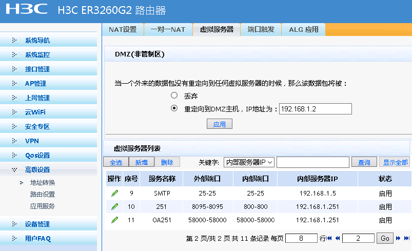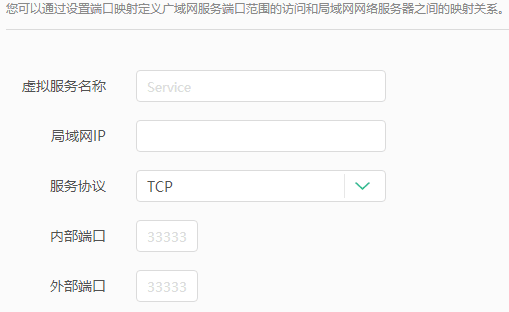 H3C路由器端口映射图示 登陆到路由器的管理界面,选择菜单中的“高级设置-》地址转换”选项,进入端口映射设置界面。 在 “虚拟服务器” 中,设置映射名称,根据实际填写: