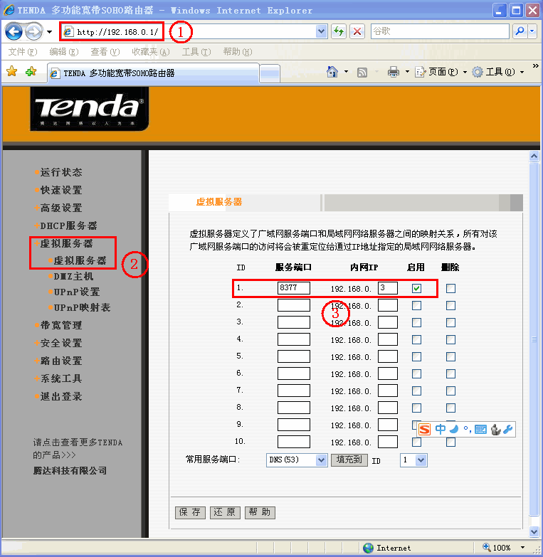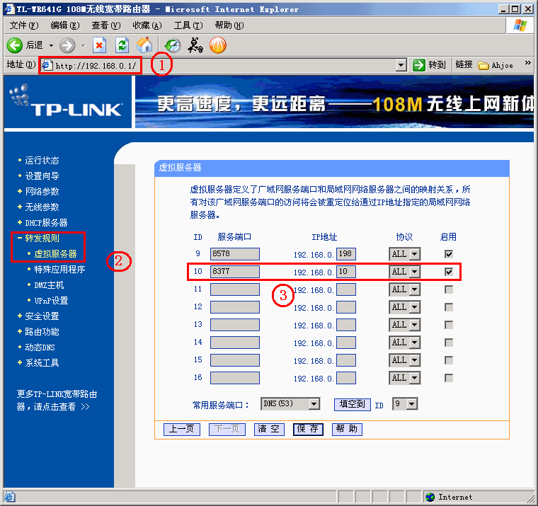 旧版TP-LINK路由器端口映射图示 1. 用浏览器打开路由器的WEB管理界面; 2. 点击导航栏里的"转发规则", 再点击"虚拟服务器"; 3. 找一个未使用的空白的映射,填上端口号8377,IP地址填服务端电脑的IP,协议选TCP或ALL都可以,再把后边的“启用”打勾; 4. 最后点一下“保存”按钮就可以了。