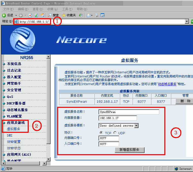 NetCore路由器端口映射图示 1. 用浏览器打开路由器的WEB管理界面; 2. 点击导航栏里的"应用及游戏", 再点击"虚拟服务"; 3. 右边虚拟服务名称填 SyncEXPwan, 内部服务器填服务端电脑的IP, 协议 TCP, 内部端口与入口端口都是 8377, 然后点"新增虚拟服务"按钮,这些设置就添加到了"虚拟服务列表"里了。这样就设置完成了。
