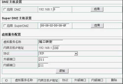 磊科NR205+路由器端口映射图示 内网192.168.1.100是管家婆财务软件的服务器,需要映射端口80、211、1433三个端口。登陆路由器选择(默认管理地址为192.168.0.1账号密码均为admin),选择NAT设置中的虚拟服务设置。虚拟服务名称可以自定义设置,内网主机IP设置为服务器的IP地址192.168.1.100,协议选择设置为TCP,外部端口和内部端口均设置为211,设置完点击添加。按照此操作继续添加映射80端口和1433端口。