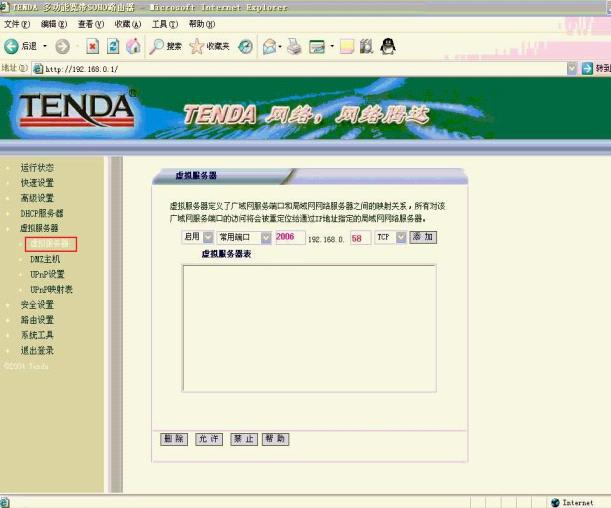 腾达402M路由器端口映射图示 需要将TCP2006端口映射到192.168.0.58。设置方法如下:登陆路由器点击虚拟服务器,第一个选项设置为启用,常用端口不需要选择,常用端口之后设置为2006,IP地址设置为192.168.0.58,协议选择为TCP,设置完成后点击后面的添加按钮。
