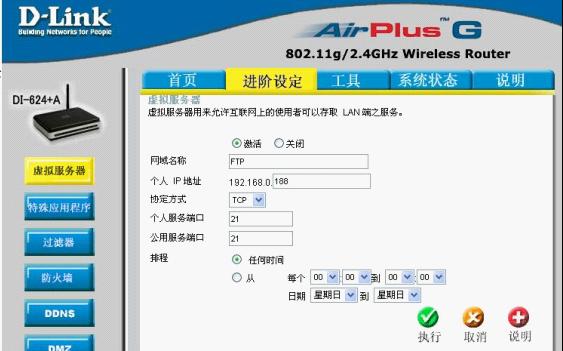 D-LINK DI624+A路由器端口映射图示 内网192.168.0.188是一台FTP服务器,FTP服务端口默认为21,需要在路由器上映射21端口到内网的服务器上,设置如下:登陆路由器,默认的管理IP地址为192.168.0.1账号admin密码为空。点路由器的进阶设定—虚拟服务器进行设置,首先需要在上方点激活,此项设置才生效。网域名称:此处可随意填写;个人IP地址:此处填写为内网服务器的IP地址192.168.0.188;个人服务端口与公用服务端这2项均设置成21;排程设置成任何时间,最后点击执行,保存此设置。