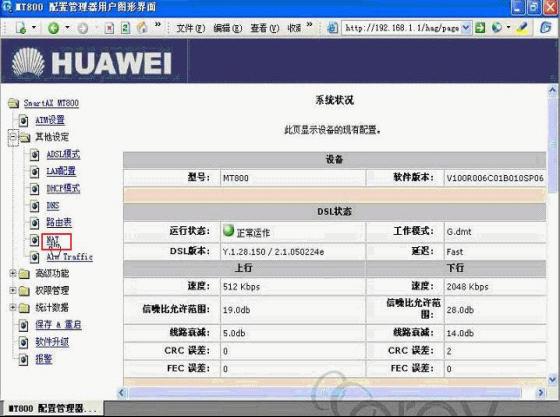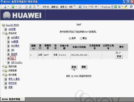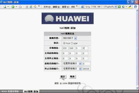 华为MT800路由器端口映射图示 登陆路由器(默认管理IP为192.168.1.1账号密码均为admin),点击路由器左边菜单当中的其他设定,再选择NAT设置选项。 然后在NAT设置中点击允许,单击下面的添加按钮,进入设置界面。 在规则类型选择为REDIRECT,协议选择TCP,本地地址填写为本地服务器的IP地址,全局起始终止地址不需要填写,起始端口和终止端口填上你需要映射的端口号,然后点击提交。