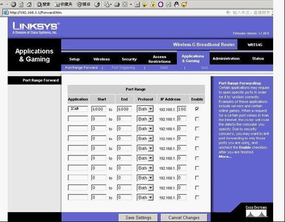 LINKSYS WRT54G路由器端口映射图示 登陆到路由器的管理界面,选择菜单中的Applications&Gaming选项,在左边的下拉菜单中选择 Port Range Forward,进入端口映射设置界面。 Application 此项设置为映射名称,自定义填写; Star和 End设置映射的起始端口,如果需要映射6000端口,在此2个选项当中均填写为6000; Protocol设置成Both或者tcp; IP Address在后面添加设置成内网服务器的IP地址; 在Enable选项当中打钩; 最后点击下面的Save Settings保存设置即可。