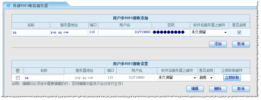 • 用户多pop3接收设置:点击【立即收取】按钮,可以马上获得该对应的外部邮箱里面的邮件;另外还可以在这里对已添加的pop3接收进行【编辑】和【删除】。