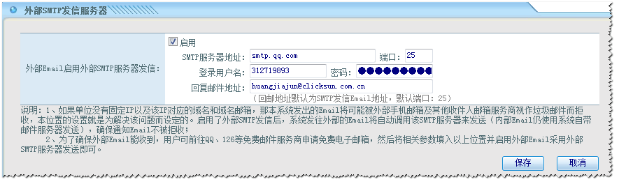 • 外部SMTP发信服务器:输入SMTP服务器地址,例如采用QQ邮箱:smtp.qq.com;输入端口和回复邮件地址,一般都是默认的;输入一个登录用户名和对应的密码,系统发出的邮件会通过该用户的端口发送出去;勾选【启用】;点击【保存】按钮完成外部SMTP送信服务器的添加。
