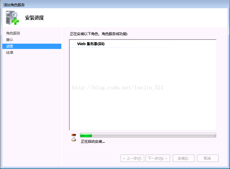 在“选择角色服务”窗格中,单击“下一步”,然后单击“确认安装选择”窗格中的“安装”。