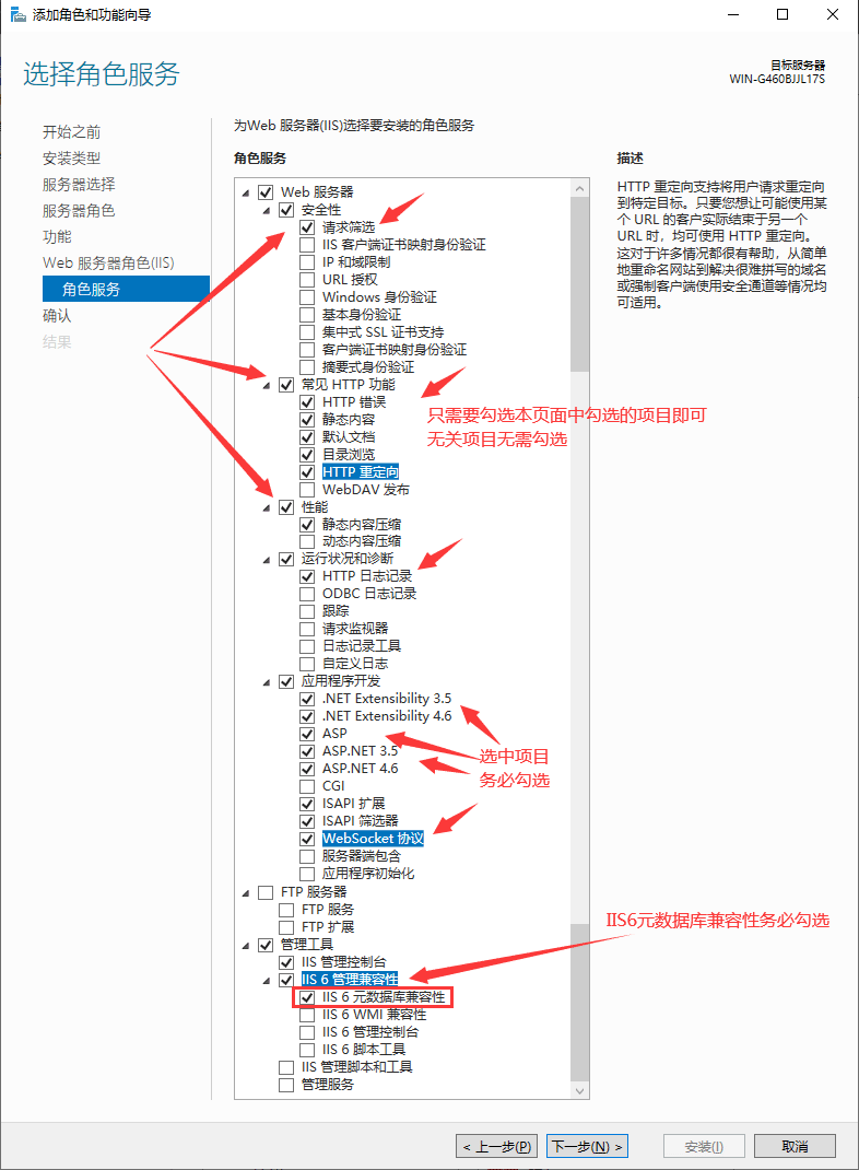 勾选IIS服务项目时,务必严格按照以上“已安装”红色勾选项目设置,切勿勾选“未安装”的项目,以免造成各种潜在的问题。