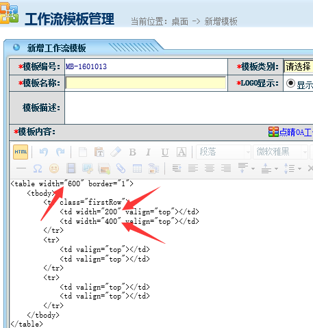 ![]() ![]() 复杂表格模板设计参考以下教程: 没有特殊原因都应该按照以上教程方法设计表单模板! 以下仅供参考,为设置表格所有列的固定列宽和行高: ![]() 如果不熟悉CSS和HTML的话,建议用Word或Excel先设置好需要宽度的表格,在Word或Excel中为了设置固定的列宽,一定要用光标拖动所有列的边框线,确保Word或Excel来后台自动设置列宽,然后将设置好的表格复制到点晴OA工作流模板编辑器中,应该就可以实现固定列宽的表格了。 ![]() 在工作流模板编辑器中,直接用鼠标光标拖动表格边框线,也可以调整列宽,方法如下: ![]() 用以上方法设置的表格,只能大致实现宽度控制,有时甚至与期望的效果相差很远。 如果熟悉HTML和CSS的话,就可以实现精确的表格固定列宽控制。在CSS中,宽度单位默认为px(像素点),在工作流表单编辑器中,切换到源码模式下,找到需要设置固定列宽的表格,在第一行tr中,找到td,然后在第一行的所有td中设置CSS宽度约束: width="100"(100是随便写的,以实际为准),设置完第一行中所有td的宽度后,再将这些宽度值相加,其合计值就是表格的宽度,然后将这个表格的table设置CSS宽度: width="960"(960是随便写的,以实际合计为准),然后将其他行tr的td中的宽度全部清除,就可以实现精确的表格列宽控制了。高度约束:height="30",height就是高度的控制CSS符号,30是px(像素),可以更改为需要的高度,如果没有这个,手工添加这个到相应单元格或表格中即可。 ![]() ![]() 注意: 固定宽度设置时,切勿将表格列宽用百分比来设置(例如:width="15%"),一定要用px(即直接使用数字:width="120"),否则一定会变形。