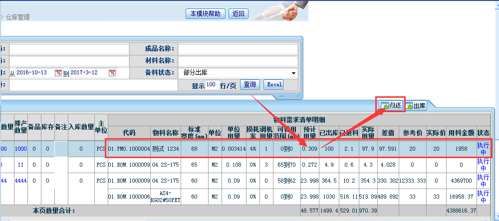 操作步骤: 仓库管理——物料出库管理——生产领料出库——新增领料出库单。如下图示: 选择对应的生产单明细,点击“归还”按钮;如下图所示: 进入下图所示页面: 点击有出库记录的明细后面的退料按钮,进入如下图所示界面: 注意事项:录入实际退料的长与宽,点击选择所入的货位,点击提交完成 点晴模切ERP更多信息:http://moqie.clicksun.cn,联系电话:4001861886 该文章在 2017/1/11 10:36:13 编辑过 |