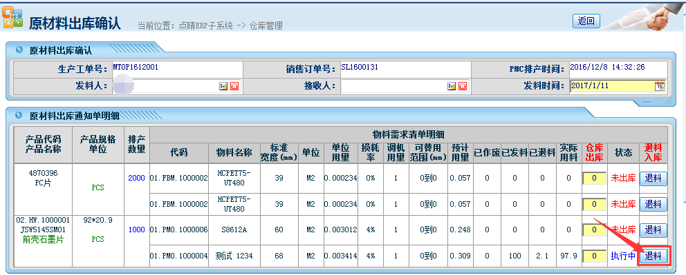 点晴模切ERP仓库出库管理——新增原材料退料入库操作