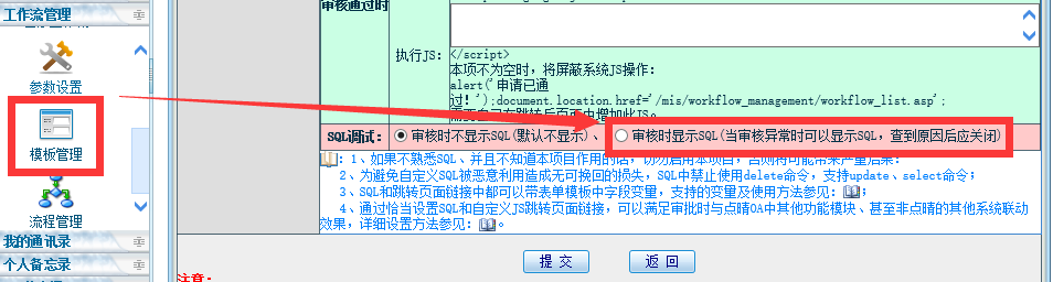 ![]() ![]() ![]() 这个出错与点晴OA升级无关!!! 出现这个错误的原因是你启用了这个流程表单模板的高级开发设置,增加了申请、审核通过或不通过时执行某个自定义SQL操作,而你的SQL语句中有错误,导致了不管是这个工作流的申请、还是审核都会被错误拦截,而无法正常进行下去! 自定义SQL错误包括但不限于: 1、有多条SQL,各个SQL之间没有用“;”分隔; 2、SQL中字段类型是数字型,却将其更新(update)或插入(insert)为文本、空格、空值、时间之类的错误类型; 3、SQL中字段类型是日期型,却将其更新(update)或插入(insert)为文本、空格、空值、数字之类的错误类型; 4、SQL中字段类型是定长的文本型,却将其更新(update)或插入(insert)为超长的文本,导致报插入内容截断错误; 5、其他错误。。。 解决方法: 方法一: 关闭该流程的自定义SQL操作,就不会再报这个错误了。 方法二: 在工作流模板维护中,找到这个模板,启用SQL调试功能,显示出错的SQL,修复错误的SQL。 如果看不到以上SQL调试功能,说明你当前系统未升级到最新版,下载升级包升级即可: