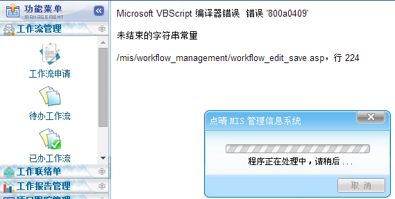 点晴永久免费OA升级后,有一个流程不管是申请还是审核都提示MicrosoftVBScript编译器错误800a0409未结束的字符串常量,如何解决?