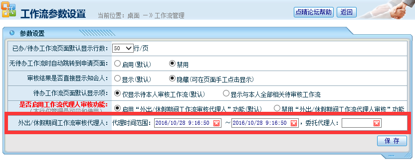 如果网管设置为:启用“外出/休假期间工作流审核代理人”功能,那么所有普通用户的这个设置位置就会出现下面红色框中内容,允许用户自行设置审核委托人和委托时间范围: