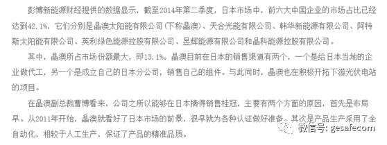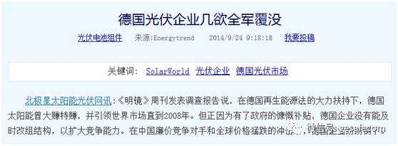 上述包括硅料在内的四个制造端主要生产环节产量均连续位居全球第一位,其中太阳能电池组件已连续九年位居全球第一位。各环节产量前10名的企业中有半数以上位于中国。 光伏产业的全球龙头是德国,一直到2008年,其全球市场份额还是世界第一,在中国企业的竞争下,德国光伏产业几乎全行业破产,博世和西门子卖掉或停止了太阳能业务。Solon、太阳能千年、Sovello、Conergy、Odersun等宣告破产。唯一幸存的大公司现在只有SolarWorld。该公司迫使债主放弃部分债务并赢得卡塔尔的大力投资,这才喘过气来。其它企业虽然还有残余或后续企业,但它们都不是独立企业。除了Solarworld外,德国太阳能工业几乎已经死亡。2013年底,德国太阳能产业只拥有4719个工作岗位。 2016年9月,只有3719名员工的德国solarworld宣布其德国工厂再次裁员500人。 不只是德国,日本光伏组件本来是被京瓷,夏普,三菱等日本本土品牌占据的,2011年,日本本土品牌还占据了日本90%的光伏市场。 而到了2014年,日本已经是中国光伏组件最大的出口市场,中国品牌已经占据了日本市场份额的40%以上。日本本土的京瓷,夏普,三菱等光伏厂家,不仅无力在海外市场和中国竞争,连本土市场也被蚕食。 中国企业不只是份额大,而且利润高。 以多晶硅料和硅片的国内龙头企业保利协鑫为例子,2016年上半年,业务收入达到人民币131.59亿元,毛利率32.9%,净利润13.89亿元,净利润率超过10%。 2016年第三季度,中国光伏组件龙头之一的晶澳太阳能公司营收为38.2亿元人民币(约合6.01亿美元),净利润为2.592亿元人民币(约合4080万美元),净利润增长69%。这仅仅是一个季度的净利润。 而日本光伏的前两名,夏普太阳能,在2016年3月结束的财政年度,亏损184亿日元,亏损超过10亿人民币。而日本京瓷太阳能2016年第二季度收入比上一季度下降13%。 光伏产业的全球份额和利润一半以上集中在中国企业手中,中国超过全世界。 不只是各环节制造工艺和市场份额的获取,核心材料也全面国产化,以光伏组件核心材料之一的EVA膜为例,既需要很好的粘性能够把电池片和组件表层玻璃粘贴在一起,又需要很好的透光度保证电池片得到阳光照射,而这些特性要在阳光照射下保持25年以上。 EVA膜的生产技术以前只掌握在日本三井化学,普林斯通,美国胜邦几家公司手里面。2003年,杭州福斯特公司才刚刚成立,2015年,该公司已经占据了全球光伏EVA膜40%的市场份额,中国品牌总全球市场份额已经占到了全球80%,美国和日本品牌基本淡出了EVA膜市场。 以2016年前三季度为例,杭州福斯特材料公司营业收入29.47亿,增长20.9%,实现净利润6.12亿,增长高达47.9%,净利润率高达20.8%,和前面提到的海康威视和福耀玻璃一样,达到了苹果公司的净利润率水平。再比如光伏组件关键材料的背板,是光伏组件实现电绝缘的核心材料,同时又要求具备很高剥离强度,对电池片起到有效的支撑作用,能够有效防止水汽渗入,同时要能抗老化,抗风沙腐蚀,还要能够有效的反射阳光,提高电池片的光伏发电效率。 2005年也是由美国杜邦,法国阿科玛几家外国企业把持全球市场,杜邦的品牌Tedlar和阿科玛的品牌KYNAR已经成了光伏背板材料代名词。TPT和TPE材料是光伏背板的标准主流材料,这个T就是指杜邦公司的Tedlar。 2007年江苏苏州成立了一家叫赛伍应用技术的公司,凭借着公司自主开发的KPK和超级KPE光伏背板材料,仅仅8年后的2015年,这家公司已经是全球光伏组件背板份额全球第一,直接挤压了国外供应商份额。 值得一提,赛伍应用技术不仅是中国光伏组件背板标准的制定者,而且也是中国变频器绝缘材料的标准制定者,一家企业制定了两个国家标准。赛伍是世界仅有的三家能够设计制造变频器绝缘胶膜的公司之一,另外两家是美国胜达(Sheldahl)和英国GTS。 除了光伏材料,中国企业还进入了光伏生产设备行业,目前主要的十种生产设备,已经有七种实现了国产化。2016年,一条100MW生产线的工艺设备的投资,仅需要6000万元左右,而在10年前,大约需要1.6亿元~2亿元。例如把光伏组件的电池片焊接在一起的串焊机,光伏组件的电池片,是用硅片制作的,非常薄,厚度在200微米以下,用机器把这些电池片用金属焊带焊接在一起,需要机器有很高的精度和技术水平,否则电池片非常容易破损。 仅仅在2013年以前,中国所有的光伏工厂购买的串焊机,都是来自德国TT(teamtechnik)、德国索蒙特(somont)、美国库迈思(komax)、西班牙格罗斯贝尔(gorosabel)、西班牙蒙特拉贡(Mondragon)、日本Toyama、日本NPC和韩国HANWHA等国外进口设备厂商,他们占据着国内太阳能电池串焊接设备行业绝对的市场份额。他们卖给中国企业的串焊机,一台价格普遍在400多万人民币以上。 2013年,中国无锡出现了两家串焊机企业,他们都实现了串焊机国产化并且推向市场,一家叫无锡奥特维,一家叫无锡先导智能,实现了国产化的串焊机,价格仅为100多万人民币,是欧洲日本企业价格的四分之一。 经过近三年的竞争和发展,2016年市场格局已大相径庭,中国市场新增产线串焊机95%变成了国产设备。在国外厂家中技术相对落伍的美国komax,日本NPC,toyama企业都相继退出串焊机市场,只有德国帝目公司teamtechnik尚有少量市场份额。 以无锡奥特维为例子,进入串焊机市场后,这家公司2013年收入还不到100万,而到2016年上半年,营业收入已经达到1.82亿。 无锡先导智能更是增速惊人,2016年前三